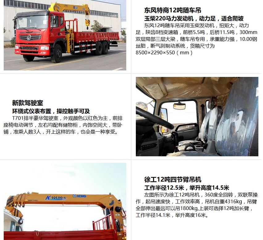 隨底盤選裝駕駛室.選裝箱板結(jié)構(gòu),選裝上/中座椅操作,可選裝直臂式或折臂式吊機,直臂式吊機:型號/吊機質(zhì)量(kg)/最大起升載荷(kg)/載質(zhì)量分別為:(QYS-10III,SQS-10III,URV1004,SPS25000,KS2305,nicoleV1004)/4000/6000/8520(2人),8455(3人);(QYS-12IV,SQS-12IV,URV1200,SPS30000,nicoleV1200)/4500/7000/9900(2人),9835(3人);.折臂吊機的分別為:(SQ10Z,QYS-10Z)/4000/6000/8520(2人),8455(3人);SQZ-12III/4500/7000/9900(2人),9835(3人);外形尺寸/軸距/前懸/后懸對應(yīng)關(guān)系分別為:10050/4350 1300/1250/ 3150(1450/2950),10550/4750 1300/1250/3250(1450/3050),11350/5350 1350/1250/3400(1450/3200),11930/5850 1350/1250/3480,12000/5850 1350/1250/3350;發(fā)動機對應(yīng)油耗值為:YC6A240-50/35.3(L/100km),ISD245 50/35.3(L/100km),ISD210 50/35.3(L/100km),YC6A270-50/35.3(L/100km);側(cè)防護:材質(zhì)Q235,螺栓連接.后下防護:材質(zhì)Q235,焊接連接,斷面尺寸120?0mm,離地高度520mm;該車應(yīng)安裝具有衛(wèi)星定位功能的行駛記錄儀.ABS型號為:3631010-C2000,生產(chǎn)廠家為:東科克諾爾商用車制動系統(tǒng)(十堰)有限公司.